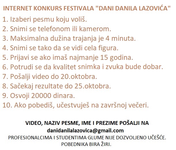 [blockquote style=”3″]I ove godine, u okviru festivala “Dani Danila Lazovića” raspisan je internet konkurs u govorenju poezije. Svi zainteresovani mogu da se prijave na konkurs . Prijave sešalјu isklјučivo na zvaničnu elektronsku adresu festivala danidanilalazovica@gmail.com. Nakon završetka konkursa, 20. oktobra, žiri odlučuje o pobedniku i to saopštava najkasnije do 25. oktobra.Pobednik će biti nagrađen sa 20000 dinara i učešćem na festivalu, u revijalnom delu programa.[/blockquote]