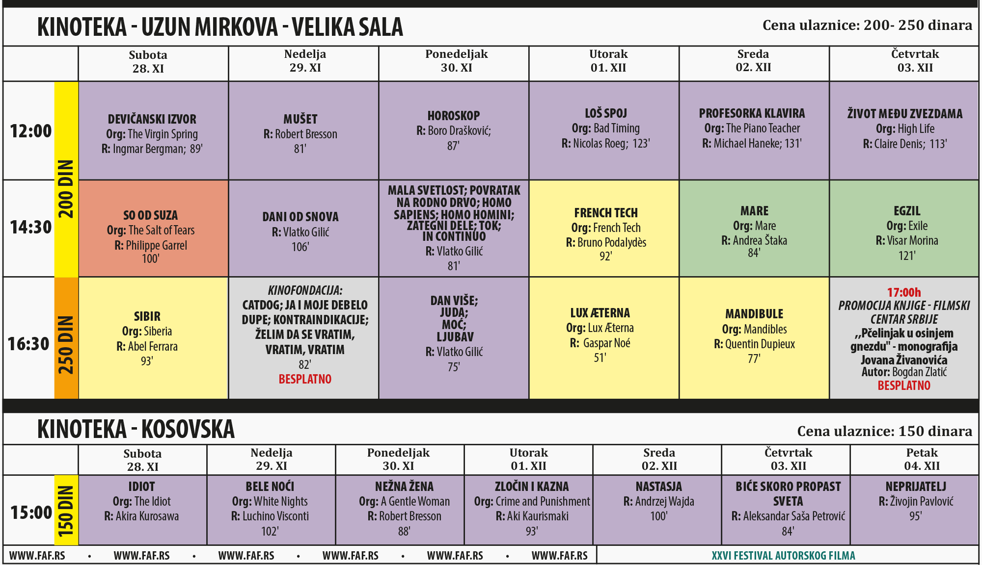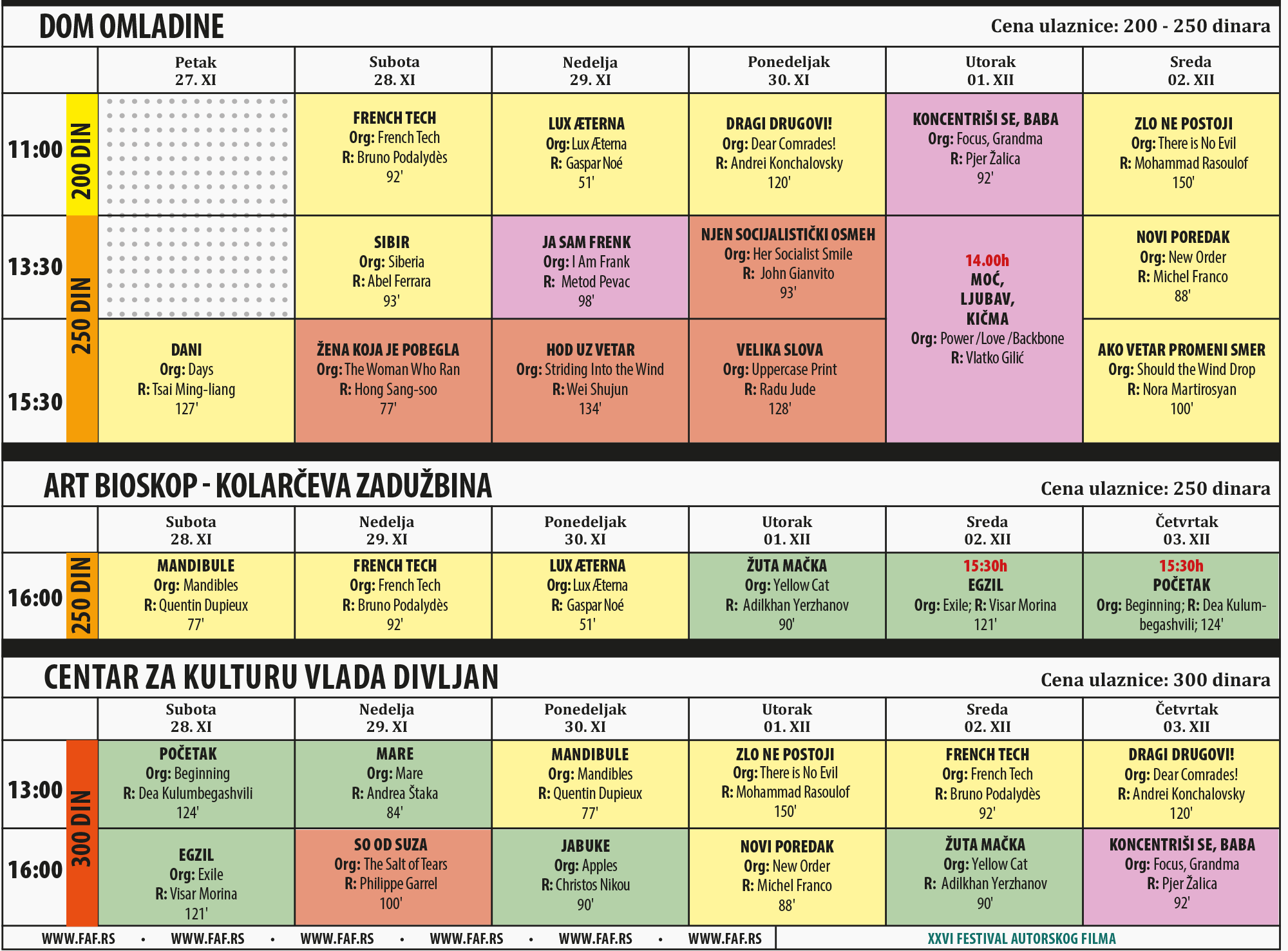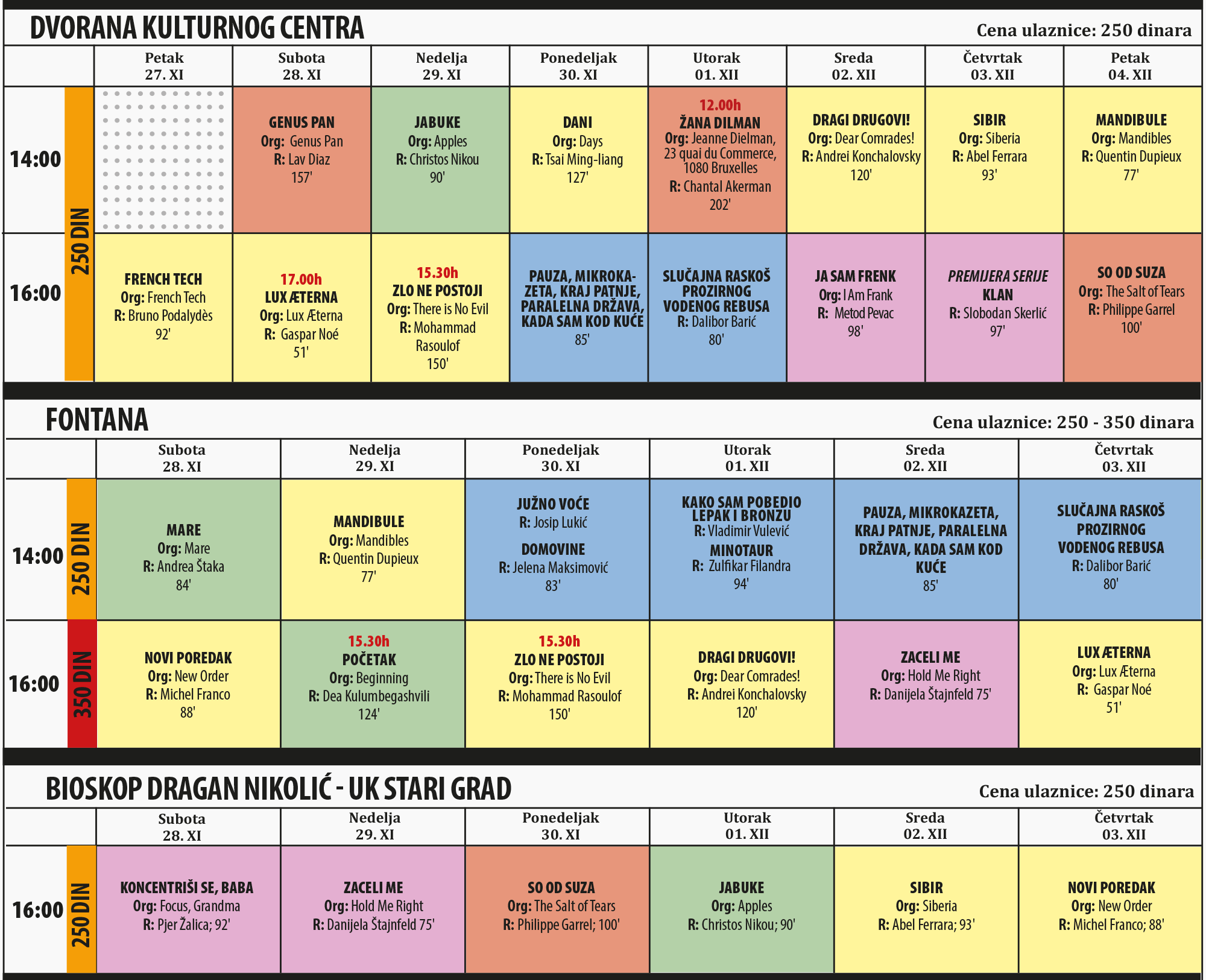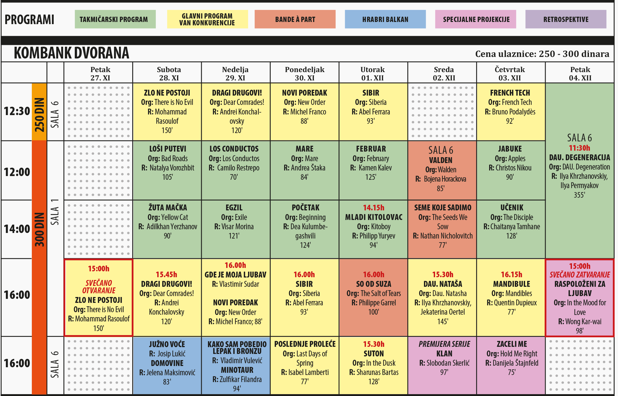 Po rasporedu Festivala, prva projekcija ovog filma je 29.novembra u Kombank dvorani, u 16 časova, a druga 1. decembra u bioskopu “Fontana” u 14 časova.