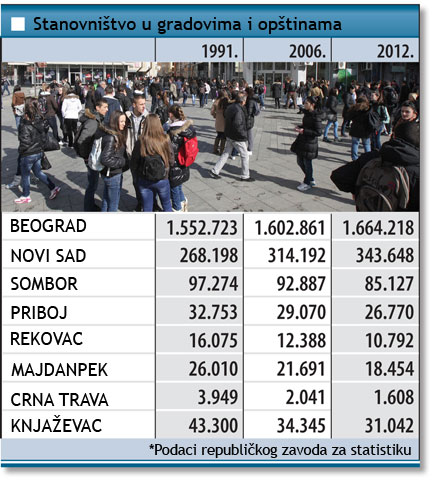 OD 1991. do 2012. Vojvodina je izgubila 110.000 stanovnika, Šumadija i zapadna Srbija 180.000, a južna i istočna Srbija više od 200.000 ljudi. Crna Trava, Majdanpek, Negotin, Rekovac i Varvarin su najdrastičnije osetili pad nataliteta i izgubili najveći procenat stanovništva.